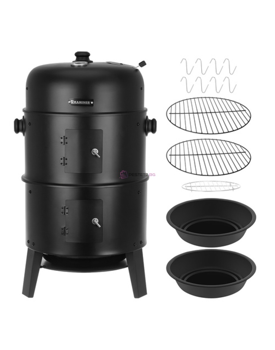 Градинска скара на дървени въглища Kaminer 3в1, пушилня с термометър, 2 решетки, 8 куки Скара с пушилня от най-високо качество